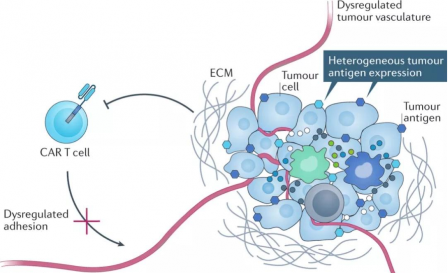 In particular , the remarkable efficacy of chimeric antigen receptor CAR-T cell therapy in hematomas is revolutionary. Currently, 9 CAR-T products are on the market for the treatment of hematomas worldwide. Compared with hematological tumors, solid tumors have the characteristics of strong tumor heterogeneity, limited target antigen selection, low T cell infiltration rate, and immunosuppressive tumor microenvironment (TME). Therefore, the application of CAR-T in solid tumors is not optimistic. The main reasons are:
