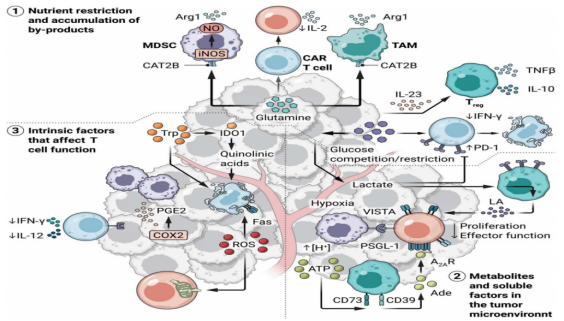 Cancer cells are metabolically active, consuming large amounts of glucose, amino acids and fatty acids from the environment to meet their nutritional needs. The rapid growth of the tumor results in nutrient deficiency and hypoxic TME. Aerobic glycolysis, the catabolism of glucose into lactic acid even in the presence of oxygen, is primarily employed by cancer cells. This adaptation supports energy requirements while preserving metabolic intermediates that can serve as carbon sources for lipid, amino acid, and nucleotide synthesis to support large-scale growth and proliferation. Interestingly, inhibitory tumor-infiltrating immune cells, including M2-like tumor-associated macrophages (TAMs), myeloid inhibitory cells (MDSCs), and regulatory T cells (Tregs), are well adapted to acidic, nutrient-deprived, and hypoxic Tmes [3]. For example, lactic acid promotes TAM differentiation into an M2-like phenotype characterized by elevated expression of arginase 1 (Arg1) and the accumulation of MDSCs in TME, rather than macrophages or dendritic cells [4]. Lactic acid and fatty acids can also be used as fuels to support the inhibition of Tregs [5]. The therapeutic potential of targeting these metabolic adaptations by inhibiting uptake of high-demand nutrients or specific metabolic pathways by tumors and tumor-infiltrating cells is currently being investigated.