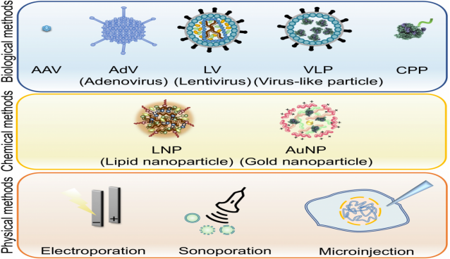 The delivery method of the CRISPR/Cas9 system is also one of the key factors affecting the efficiency of gene editing [7]. Delivery mainly takes three forms: ① Delivery of plasmid DNA encoding Cas9 and sgRNA; ② Delivery of Cas9 mRNA and sgRNA elements; ③ Delivery of RNP (ribonucleoprotein, Cas9 protein and sgRNA complex). Different delivery methods are selected according to different delivery forms, which can be divided into three main groups according to the cell entry mechanism: (1) biological methods, (2) chemical methods, and (3) physical methods. Biological methods utilize natural biological materials such as viral proteins, peptides or cellular receptors/membranes to mediate entry into cells. This category includes viral vectors, virus-like particles (VLPs), and cell-penetrating peptides (CPPs). Chemical methods use synthetic materials, such as polymers, lipids, or metals, to facilitate entry into cells. This category includes liposomes, gold nanoparticles (AuNPs), and lipid nanoparticles (LNPs). Physical methods rely on the physical energy of electricity or ultrasound to deliver genes into cells. This category includes electroporation, sonoporation, and microinjection.
