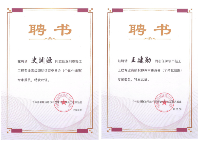 继董事长史渊源、首席科学家王建勋2023年先后取得专家委员的荣誉称号之后,又取得深圳市轻工工程专业高级职称评审委员会(个体化细胞)专家委员,该评审委员会是以细胞技术国地实验室作为深圳市市属专业技术资格评审委员会的日常工作部门,在深圳市人力资源和社会保障局等上级相关部门的指导下,组织专家并召开相关专业的自主职称评审工作。