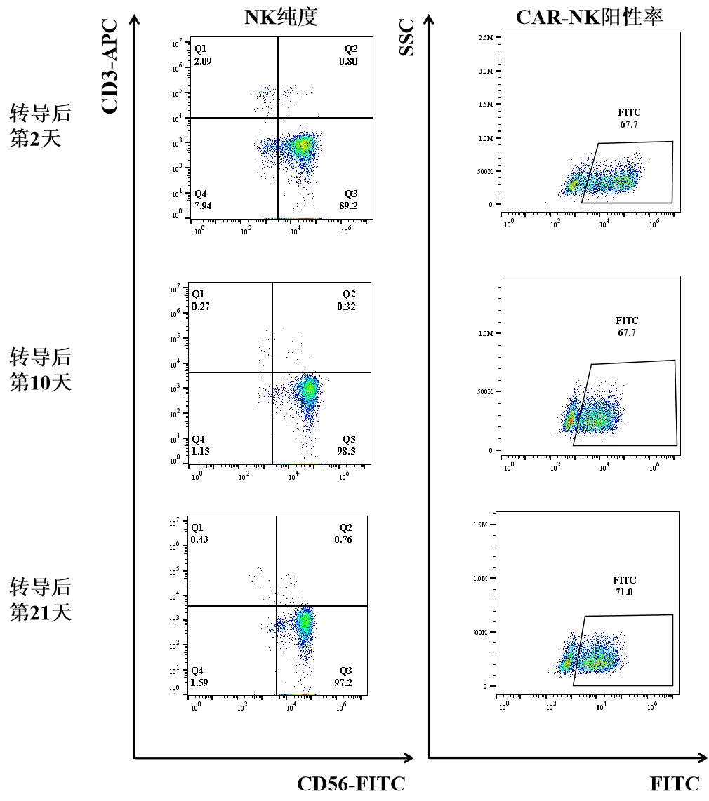 运用深圳凯发K8独有的PackRV-SS系统生产的逆转录病毒载体转导NK细胞技术,其转导效率稳定在60%以上,且阳性率不断保持稳定;而且CAR-NK细胞在转导后培养的30天内增殖可达10000倍。