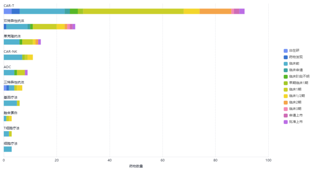 图4:排名前十的药物类型及其药物所属研发阶段的分布(来源:智慧芽)