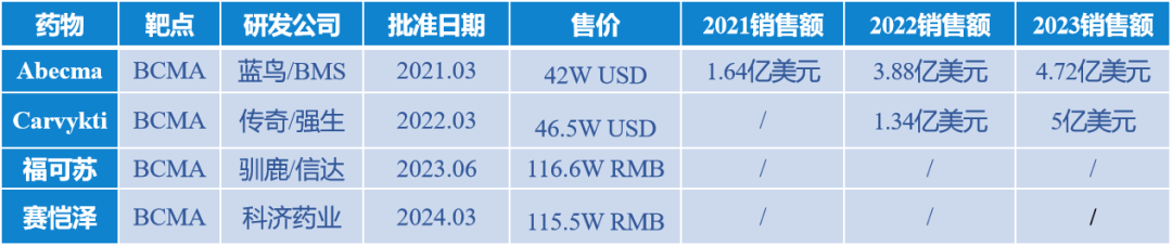 已经上市的4款靶向BCMA的CAR-T产品,价格均在百万元以上,Abecma和Carvykti来自国外,于2021年和2022年上市,已经披露的销售额显示出逐年上涨的趋势。福可苏和赛恺泽来源于国内,分别于2023年和2024年上市,暂时没有公布销售数据。4款CAR-T产品在临床治疗试验中均表现出卓越的成绩。