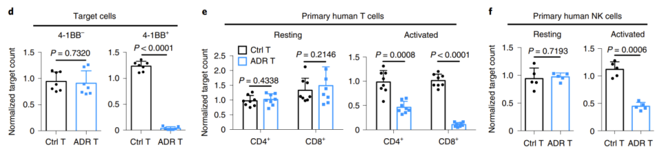 First, the researchers co-cultured ADR-transduced T cells with human primary resting T cells, NK cells, and activated T cells and NK cells in vitro. The results showed that ADR T cells could selectively eliminate activated T cells and NK cells through 4-1BB in vitro, but had no effect on resting immune cells (Figure 1).