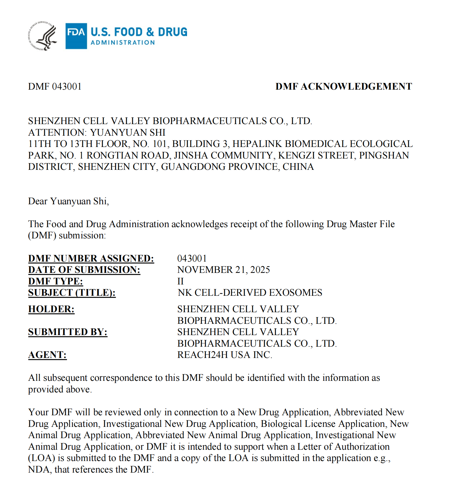 China1·Shenzhen, December 2025) – Shenzhen Cell Valley Biomedical Co., Ltd. officially announced: The company's submitted NK Cell-Derived Exosomes have been formally accepted for Drug Master File (DMF) filing by the U.S. Food and Drug Administration (FDA), with the filing number DMF043001, classified as Type II DMF.