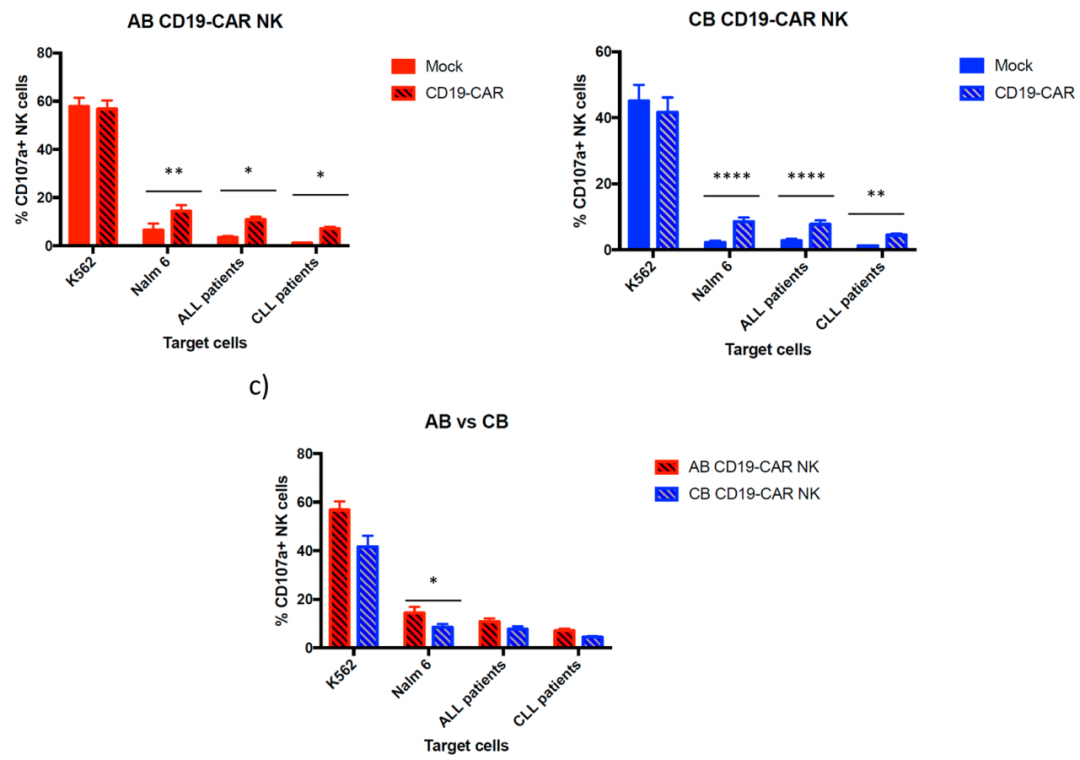CD107a表面表达水平与NK细胞的细胞毒活性、细胞因子分泌之间存在直接相关性。本研究顺利获得对细胞表面CD107a的表达来比较CD19 CAR-NK细胞与非转导NK细胞对表达CD19细胞的脱颗粒能力。实验结果显示,转导或未转导CD19 CAR的AB和CB NK 细胞在K562存在下表现出类似的脱颗粒活性。在CD19阳性细胞(如Nalm-6、ALL和CLL原代患者肿瘤细胞)中,AB CD19 CAR-NK细胞比未转导的AB NK细胞表现出更高的脱颗粒活性。CB CD19 CAR-NK细胞比未转导的CB NK细胞表现出更高的脱颗粒活性。AB CD19 CAR-NK细胞相较于CB CD19 CAR-NK细胞CD107a的表达略高一点。