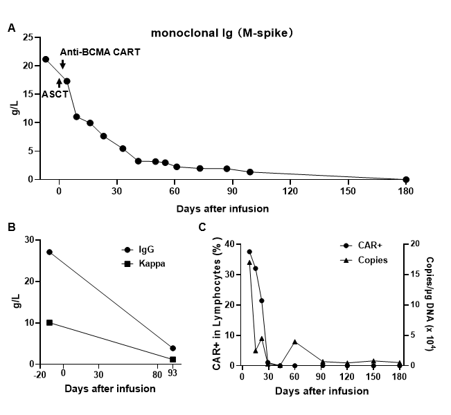 患者1,男,41岁,初期检测血清M蛋白含量70.28g/L,经过VCD、VRD、DKd、DKRd±苯达莫司汀等治疗PR后疾病进展,病情控制不佳,经过多重化疗后血清M蛋白含量降至20.23 g/L并产生骨髓抑制,经过专家评估后,2023-8-26采用ASCT和靶向BCMA的CAR-T细胞联合治疗。ASCT和靶向BCMA CAR-T输注33天后,血清M蛋白降至5.46 g/L,显著降低90%以上,达到VGPR,第三个月血清M蛋白降至1.35 g/L,第6个月已经检测不到;IgG和血清Kappa含量也持续降低,第6个月IgG转阴,评判CR,现已治疗9个多月未见患者复发。